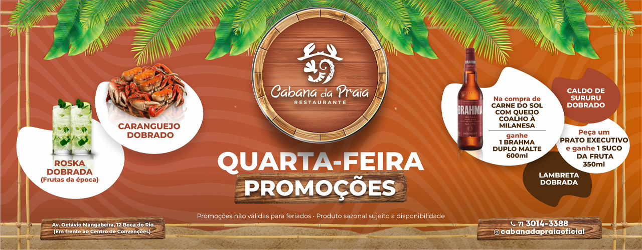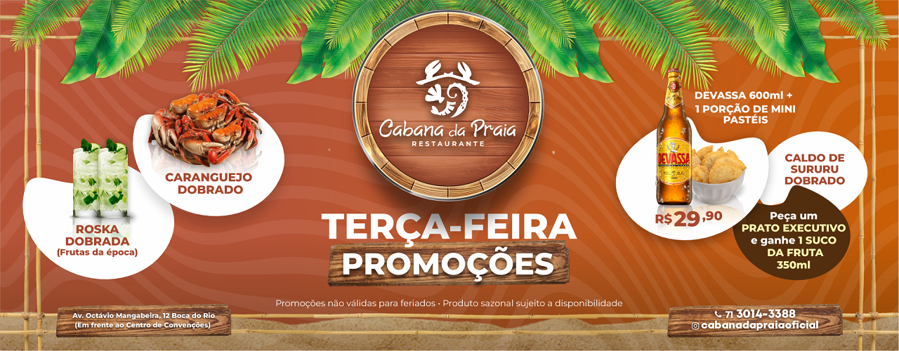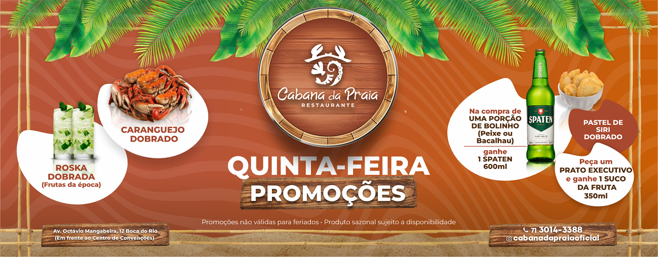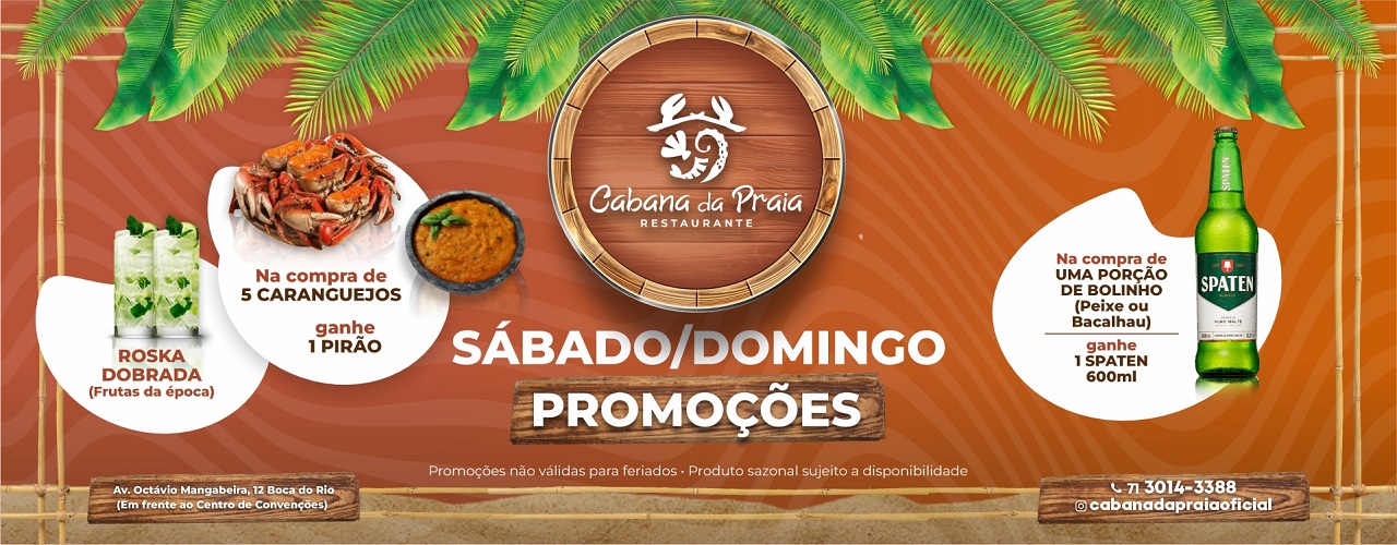 O estabelecimento Cabana da Praia, é um daqueles que não se preocupam com a modéstia. Onde quer que apareça o nome da casa em seguida está escrito: o melhor caranguejo da Bahia — afirmado!
